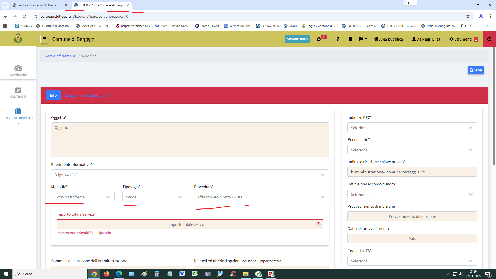 Avrei bisogno di chiedere una cosa: io uso spesso la piattaforma “TUTTOGARE BERGEGGI” e mi chiedevo questo, visto il caso presente: è sbagliato impostare una procedura EXTRA-PIATTAFORMA (=> avendo già un preventivo arrivato o secondo l’uso della corrispondenza commerciale ad un indirizzo appartenente al dominio del Comune di Bergeggi (=> @comune.bergeggi.sv.it) o al Protocollo del Comune medesimo per importi superiori a 5000 euro?