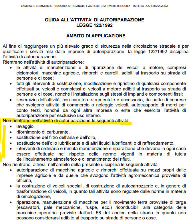 La stessa esclusione, quantomeno per quanto riguarda le prime 4 operazioni, è ribadita praticamente in tutte le pagine delle diverse CCIAA disponibili in rete. La cosa non stupisce, visto che i suddetti interventi sono esclusi dall’attività di autoriparazione per esplicita indicazione della legge (art. 1. c. 2, legge 122/92).