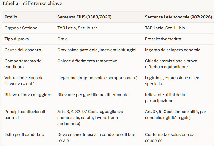 La recente sentenza del TAR Lazio, Sezione IV-ter, n. 3388 del 23 febbraio 2026, ha sollevato un’importante questione riguardante l’esclusione di un candidato da un concorso pubblico a causa della sua assenza a una prova orale, giustificata da motivi di forza maggiore. Il Tribunale ha dichiarato illegittima la clausola del bando che prevedeva tale esclusione, ritenendo che violasse i principi di uguaglianza sostanziale (art. 3 Cost.), di buon andamento della pubblica amministrazione (art. 97 Cost.) e il principio nemo tenetur.