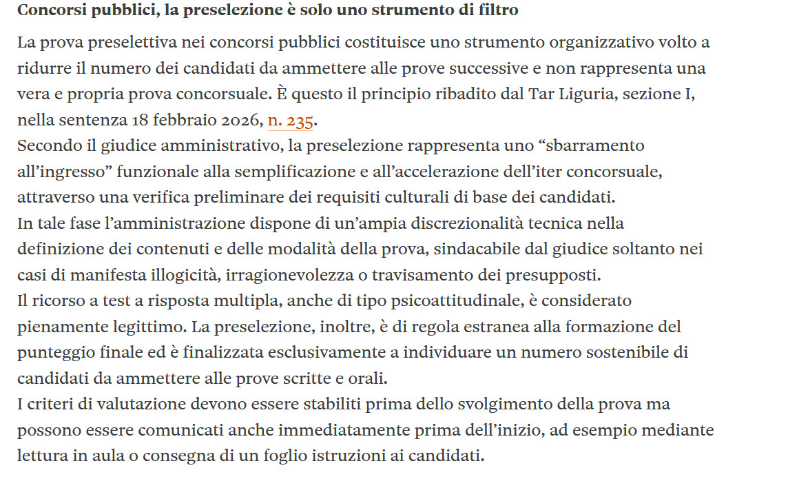La preselezione nei concorsi pubblici rappresenta un’importante fase del processo selettivo, concepita per ridurre il numero di candidati che accedono alle prove successive. Questa fase, come evidenziato dalla sentenza del TAR Liguria n. 235 del 18 febbraio 2026, non incide sul merito dei candidati, ma funge da filtro preliminare, in linea con il principio di efficienza amministrativa sancito dall’articolo 97 della Costituzione italiana.